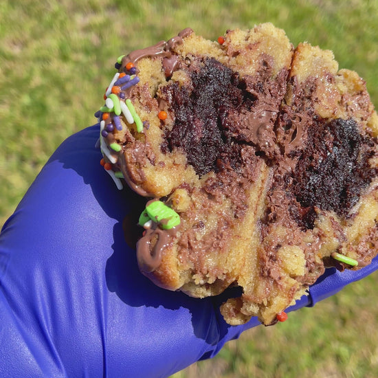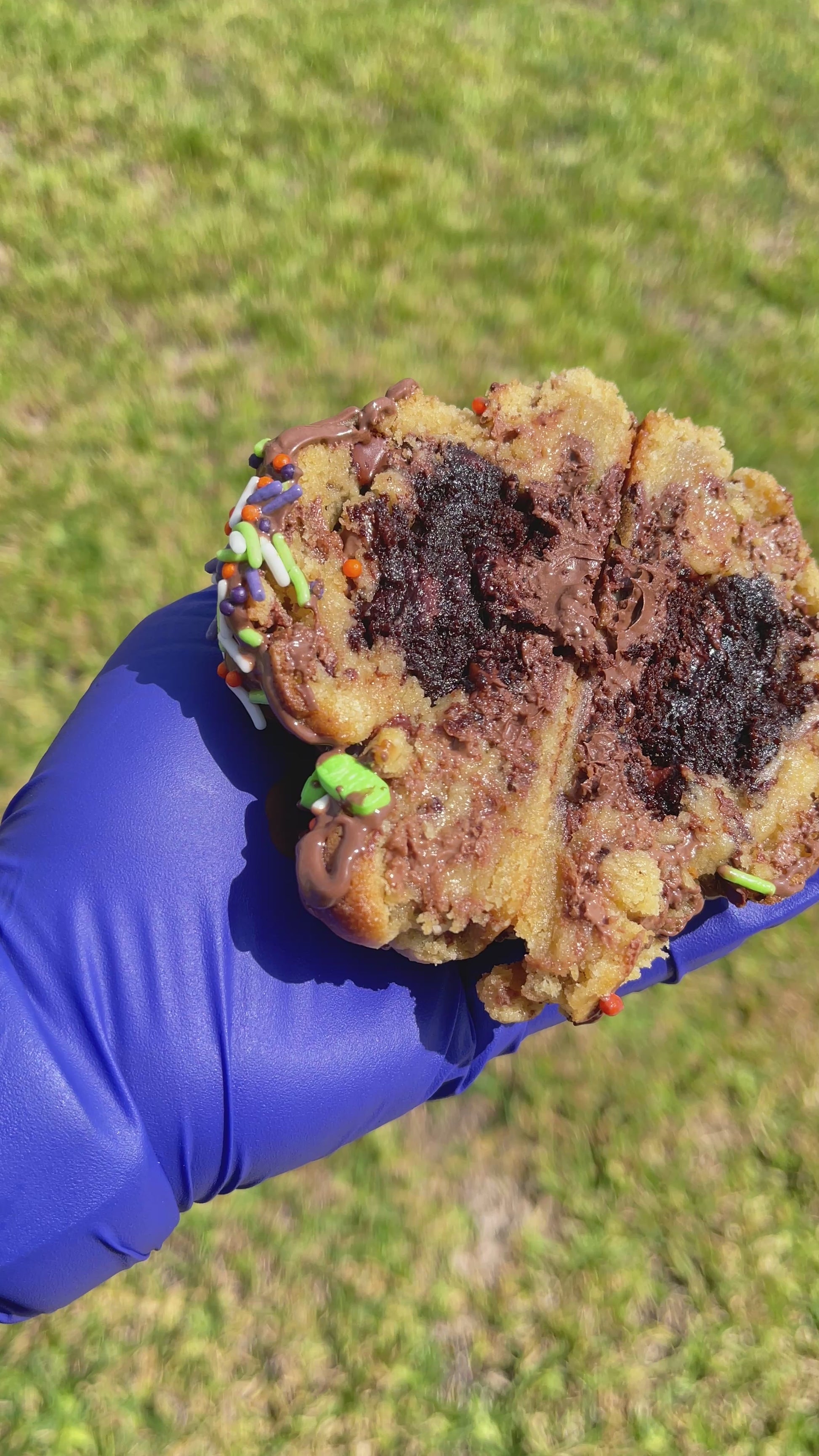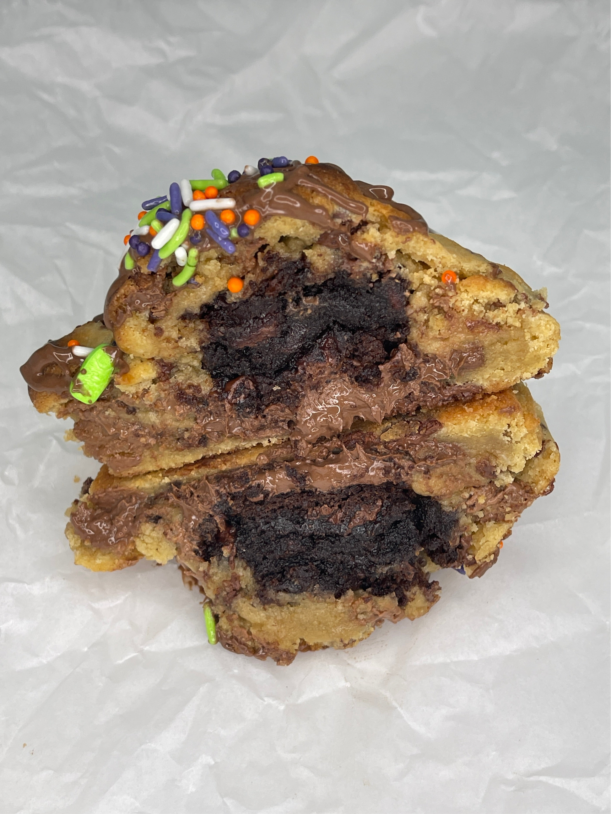 A soft and chewy cookie with a fudgy brownie center, decorated with festive Halloween sprinkles for a limited seasonal treat.